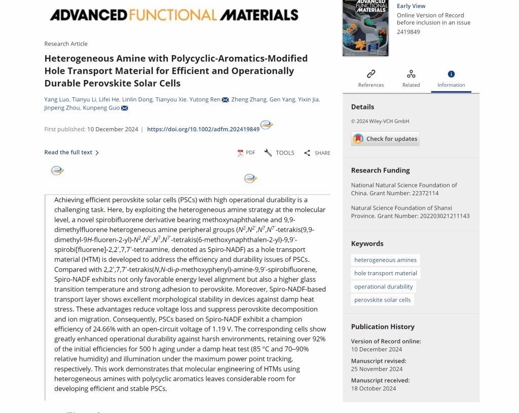 近日,浦京新材料界面科学与工程教育部重点实验室有机光电课题组郭鹍鹏教授团队在提升空穴传输材料热应力稳定性和钙钛矿太阳能电池耐用性研究领域取得重要研究进展。研究成果以“Heterogeneous Amine with Polycyclic-Aromatics-Modified Hole Transport Material for Efficient and Operationally Durable Perovskite Solar Cells”为题,发表在国际顶级学术期刊《Advanced Functional Materials》(影响因子18.5)。该论文的第一署名单位为350vip浦京集团官网,浦京硕士研究生罗杨和浙江大学博士研究生李天宇为论文共同第一作者,郭鹍鹏教授和普林斯顿大学博士后研究员任宇桐为论文共同通讯作者。