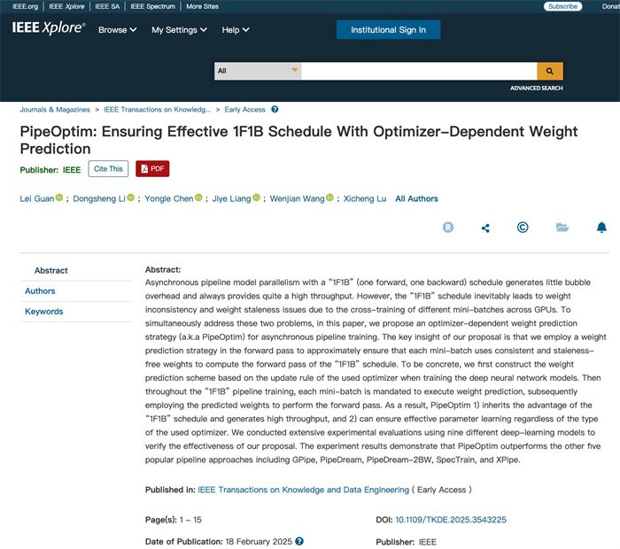 近日,350vip浦京集团官网计算机科学与技术学院关磊副教授以第一作者兼通讯作者在CCF A类国际顶级期刊IEEE Transactions on Knowledge and Data Engineering(简称IEEE TKDE)上发表最新研究论文,题目为“PipeOptim:Ensuring Effective 1F1B Schedule With Optimizer-Dependent Weight Prediction”。论文由350vip浦京集团官网陈永乐教授,国防科技大学李东升研究员、卢锡城研究员,以及山西大学梁吉业教授、王文剑教授共同合作完成。IEEE Transactions on Knowledge and Data Engineering是中国计算机学会(CCF)推荐的A类顶级国际期刊,在数据挖掘领域享有极高的学术声誉。
