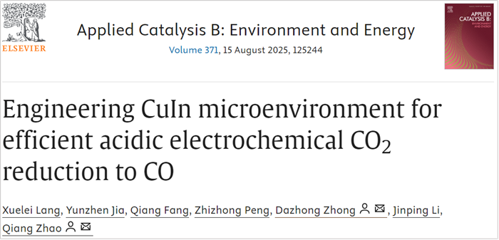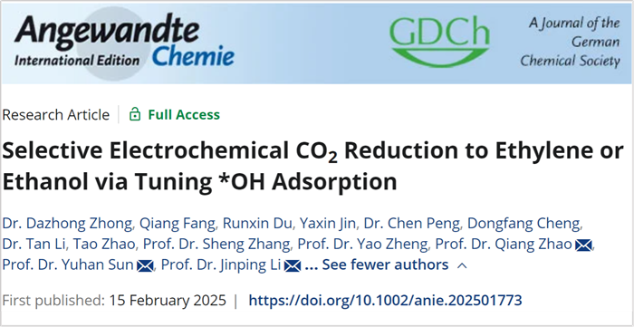 浦京化学与化工学院李晋平教授团队赵强教授课题组在电催化CO2还原制备乙烯、乙醇以及酸性条件下的一氧化碳等产物方面取得突破,相继在国际化学知名期刊《Angew. Chem. Int. Ed.》以及催化领域知名期刊《Appl. Catal. B》上发表题为 “Selective Electrochemical CO2 Reduction to Ethylene or Ethanol via Tuning *OH Adsorption”和“Engineering CuIn microenvironment for efficient acidic electrochemical CO2 reduction to CO”的研究论文。