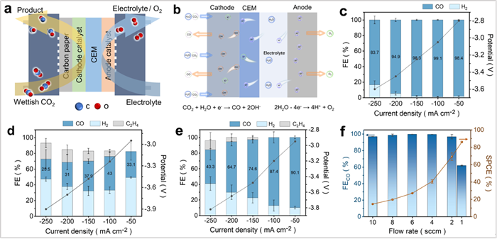 碱性/中性电解液膜电极(MEA)反应器中,CO2易与OH-进行反应生成碳酸盐,造成盐析堵塞气体扩散电极且单程CO2转化效率低,CO2-CO-C2+串联CO2还原是潜在的实现高效CO2RR应用的有效途径。为提高酸性条件下CO产物的选择性,研究团队提出利用铜基双金属(CuIn)气凝胶材料丰富的纳米级孔道网络有效阻隔CO2RR反应本身产生的OH-扩散,由此形成的“界面局部碱性微环境”能有效抑制析氢副反应。在酸性体系膜电极中,双金属多孔材料实现了99.1±0.3% 的CO法拉第效率,单程碳效率高达86%。论文通讯署名单位350vip浦京集团官网化学与化工学院,赵强教授和教师钟达忠为共同通讯作者,博士研究生郎学磊为第一作者( DOI:10.1016/j.apcatb.2025.125244)。