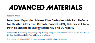 近日,浦京环境与生态学院、大气复合污染识别与控制山西省重点实验室王建成教授带领团队在锂-二氧化碳电池研究方向,首次基于扩层结构和富缺陷MXene柔性电极实现以草酸盐为产物的二电子反应路径,有效克服了传统碳酸盐路径的能耗高和通道堵塞问题。相关研究成果在国际顶级期刊《Advanced Materials》上发表题为“Interlayer Expanded MXene Film Cathodes with Rich Defects for Flexible 2-Electron Oxalate-Based Li-CO2 Batteries: A New Path to Enhanced Energy Efficiency and Durability”的研究论文。