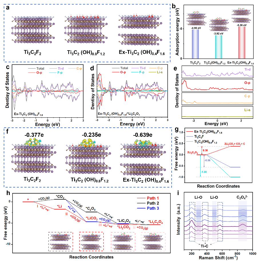 为攻克上述难题,研究团队另辟蹊径,通过层间工程与缺陷调控,成功突破了MXene基锂-二氧化碳电池在活性、稳定性和柔性设计的关键难题,构建了兼具高性能、长寿命与柔性锂-二氧化碳电池的开发提供了关键技术支撑,显著拓展了MXene材料在能源存储领域的应用。结合原位表征与基于密度泛函理论计算方法深入探究电池反应路径及性能提升的内在机制,显著提升CRR/CER的可逆性并降低过电位。并首次揭示二电子反应路径的稳定机制,为设计高效催化剂提供了全新的理论依据与思路。论文第一署名单位为350vip浦京集团官网,青年教师李雪莲与硕士研究生王璇为共同第一作者。