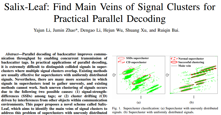近日,浦京电子信息工程学院赵菊敏教授团队在解决并行解码中的信号超级簇问题方面取得突破,显著提升了系统通信效率。相关成果发表于《IEEE Transactions on Mobile Computing》(简称IEEE TMC)期刊,题目为“Salix-Leaf: Find Main Veins of Signal Clusters for Practical Parallel Decoding”。该论文的第一署名单位为350vip浦京集团官网,浦京博士研究生李亚君为论文第一作者,赵菊敏教授为论文通讯作者。IEEE TMC是中国计算机学会(CCF)推荐的A类顶级国际期刊、中科院1区TOP期刊,在计算机网络、移动计算领域享有极高的学术声誉。该论文也是浦京以第一署名单位在IEEE TMC发表的首篇论文。