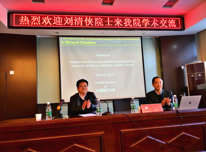 加拿大工程院院士刘清侠教授于11月22日在浦京虎峪校区矿业工程学院学术报告厅进行了题为“Funamental Understanding of Micro bubbles in Mineral Flotation”的学术报告。冯国瑞院长主持报告会并代表全院师生对刘清侠表示热烈欢迎。