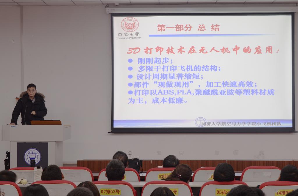 沈海军介绍了国外3D打印技术在无人机和微小飞机领域的发展与应用现状,涉及3D打印材料和无人机的飞行原理,还介绍了同济大学3D打印飞行器/微小飞机研究现状,重点展示了课题组的研究成果,引起了师生们的极大兴趣。