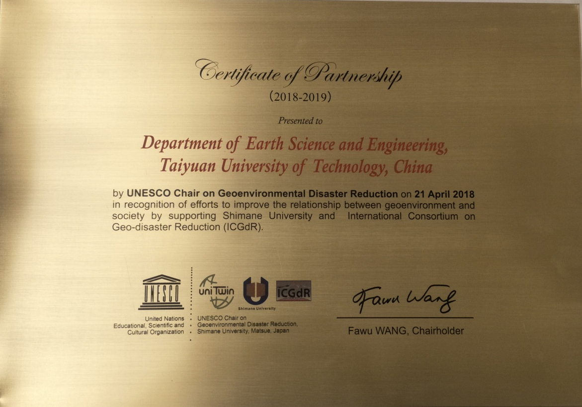 (UNESCO-Chair on Geoenvironmental Disaster Reduction)国际协作单位证书