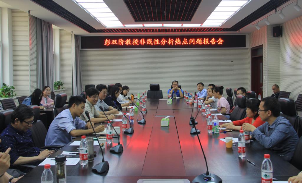 5月13日下午,华中师范大学数学与统计学院院长彭双阶教授应数学学院邀请于明向校区数学楼602报告厅以非线性热点问题做了专题报告。数学学院院长张建文、副院长柴玉珍、杨卫华以及各系部中心主任、部分教师参加报告会。