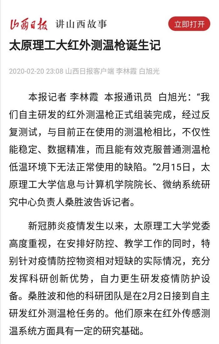 本报记者 李林霞 本报通讯员 白旭光:“我们自主研发的红外测温枪正式组装完成,经过反复测试,与目前正在使用的测温枪相比,不仅性能稳定、数据精准,而且能有效克服普通测温枪低温环境下无法正常使用的缺陷。”2月15日,350vip浦京集团官网信息与计算机学院院长、微纳系统研究中心负责人桑胜波告诉记者。