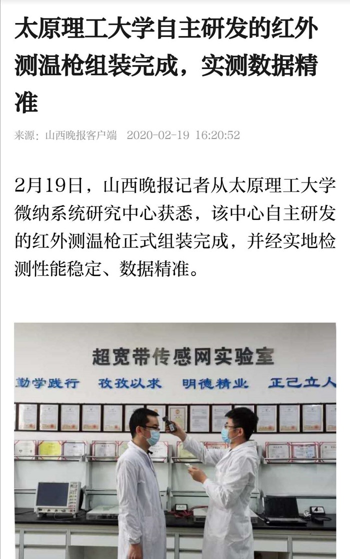 据了解,在成功研制出具有完全自主知识产权红外测温枪的基础上,微纳系统研究中心乘胜出击,又提出研制新型冠状病毒感染的肺炎患者人体生理特征监测系统。该系统可实现对隔离人员体温、心率、血氧、血压等基本体征数据的无线在线医学观察和分析判断,有效避免医护人员与可疑人群或患者直接接触引起交叉感染。目前该系统正在加紧研发中。