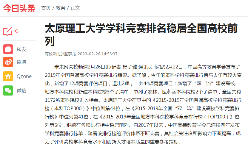 未来网高校频道2月26日讯(记者 杨子健 通讯员 侯智)2月22日,中国高等教育学会发布了2019年全国普通高校学科竞赛排行结果。据了解,今年的本科学科竞赛排行榜与去年有较大变化,新增了12项竞赛评估项目,退出2项,一共44项竞赛项目;新增了“双一流”建设高校、地方本科院校和新建本科院校3个子清单,单列了农林、医药类本科院校2个子清单,全国共有1172所本科院校进入榜单。350vip浦京集团官网在其中的《2015-2019年全国普通高校学科竞赛排行榜(本科TOP300)》中位列第44位,在《2015-2019年全国“双一流”建设高校学科竞赛排行榜》中位列第41位,在《2015-2019年全国地方本科院校学科竞赛排行榜(TOP100)》位列第6位,继续在各项排行榜中稳居前列。自2017年以来,中国高等教育学会已连续四年发布学科竞赛排行榜单,随着该排行榜的评价体系不断完善,其社会关注度和影响力不断提高,成为了评价高校学科竞赛水平和创新人才培养质量的重要参考指标。
