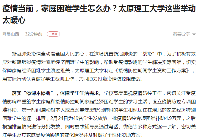 开通学生临时困难补助绿色通道,一切审批流程从简。按照《350vip浦京集团官网临时困难补助管理办法》,对疫情期间因突发事件导致家庭经济困难的学生进行一事一议给予500-2000元的及时资助。对受到疫情影响的家庭经济困难学生进行细致摸排的基础上,重点聚焦疫情严重地区和贫困地区,重点关注建档立卡、低保、特困救助供养、残疾等特殊困难学生群体。帮助解决学生的经济困难,做好学生的心理辅导,鼓励大家积极面对疫情,共克时艰。(网易山西 张丽 闫珊)
