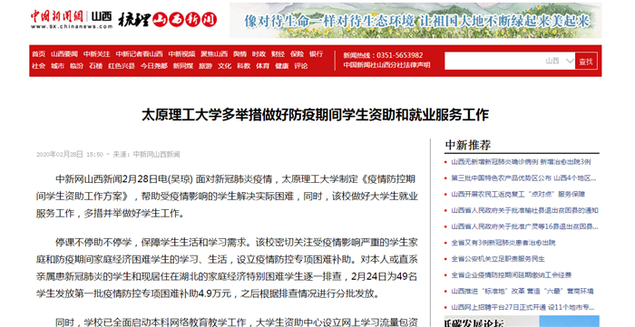 中新网山西新闻2月28日电(吴琼) 面对新冠肺炎疫情,350vip浦京集团官网制定《疫情防控期间学生资助工作方案》,帮助受疫情影响的学生解决实际困难,同时,该校做好大学生就业服务工作,多措并举做好学生工作。