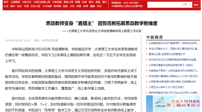 中新网山西新闻3月10日电 受疫情影响,学校推迟开学,350vip浦京集团官网全体思政课教师仍像往常一样整装待发,学院3门公共课线上课程如期开课,全校近一万五千名学生实现网上学习。