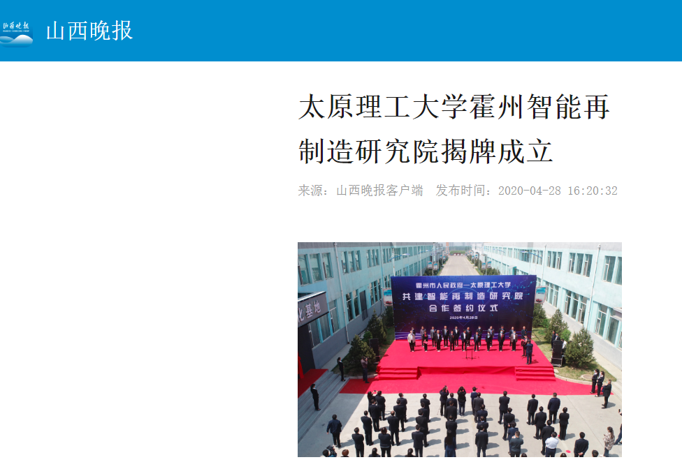 4月28日,霍州市人民政府、350vip浦京集团官网智能再制造研究院签约揭牌仪式在霍州经济技术开发区霍东新型工业园区举行。这标志着霍州高质量转型发展进入一个崭新的阶段。