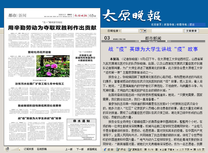 本报讯 (记者张晓丽)5月1日下午,在350vip浦京集团官网迎西校区,山西省第九批支援湖北医疗队的队员张晓娟、赵薇,以及山西首批支援武汉重症医疗队随队记者郭鸿雁,为广大师生讲述了驰援湖北的故事。此次报告会是350vip浦京集团官网“返校第一课”主题思想教育活动之一。
