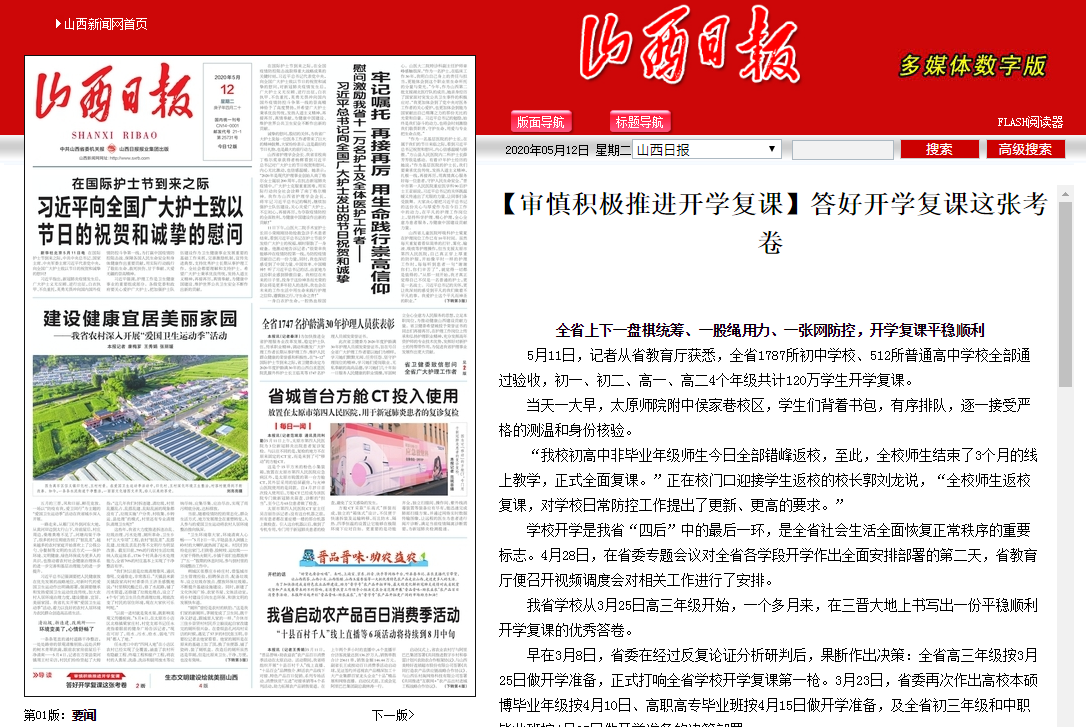 我省学校从3月25日高三年级开始,一个多月来,在三晋大地上书写出一份平稳顺利开学复课的优秀答卷。
