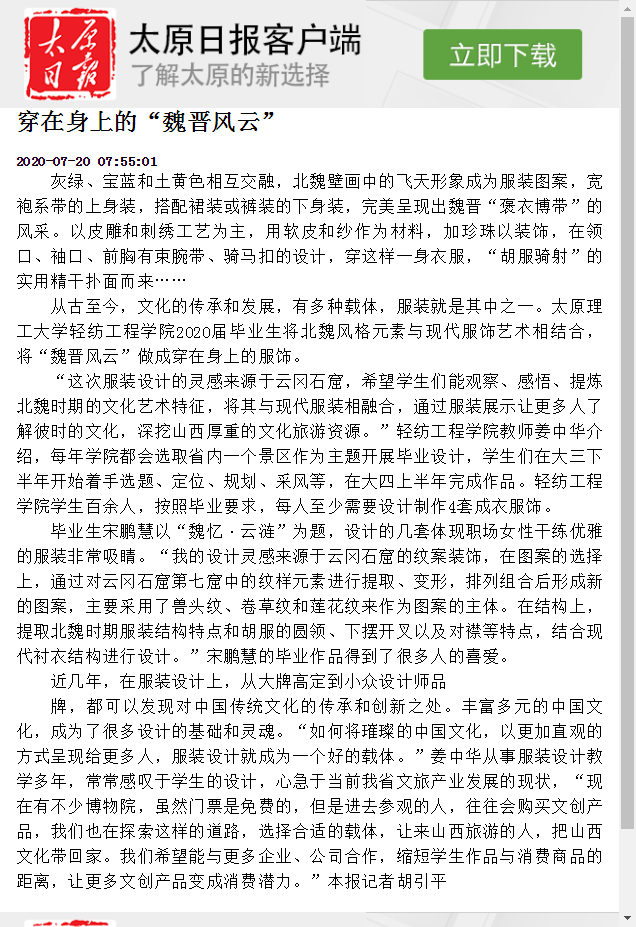 牌,都可以发现对中国传统文化的传承和创新之处。丰富多元的中国文化,成为了很多设计的基础和灵魂。“如何将璀璨的中国文化,以更加直观的方式呈现给更多人,服装设计就成为一个好的载体。”姜中华从事服装设计教学多年,常常感叹于学生的设计,心急于当前我省文旅产业发展的现状,“现在有不少博物院,虽然门票是免费的,但是进去参观的人,往往会购买文创产品,我们也在探索这样的道路,选择合适的载体,让来山西旅游的人,把山西文化带回家。我们希望能与更多企业、公司合作,缩短学生作品与消费商品的距离,让更多文创产品变成消费潜力。”(太原日报 胡引平)