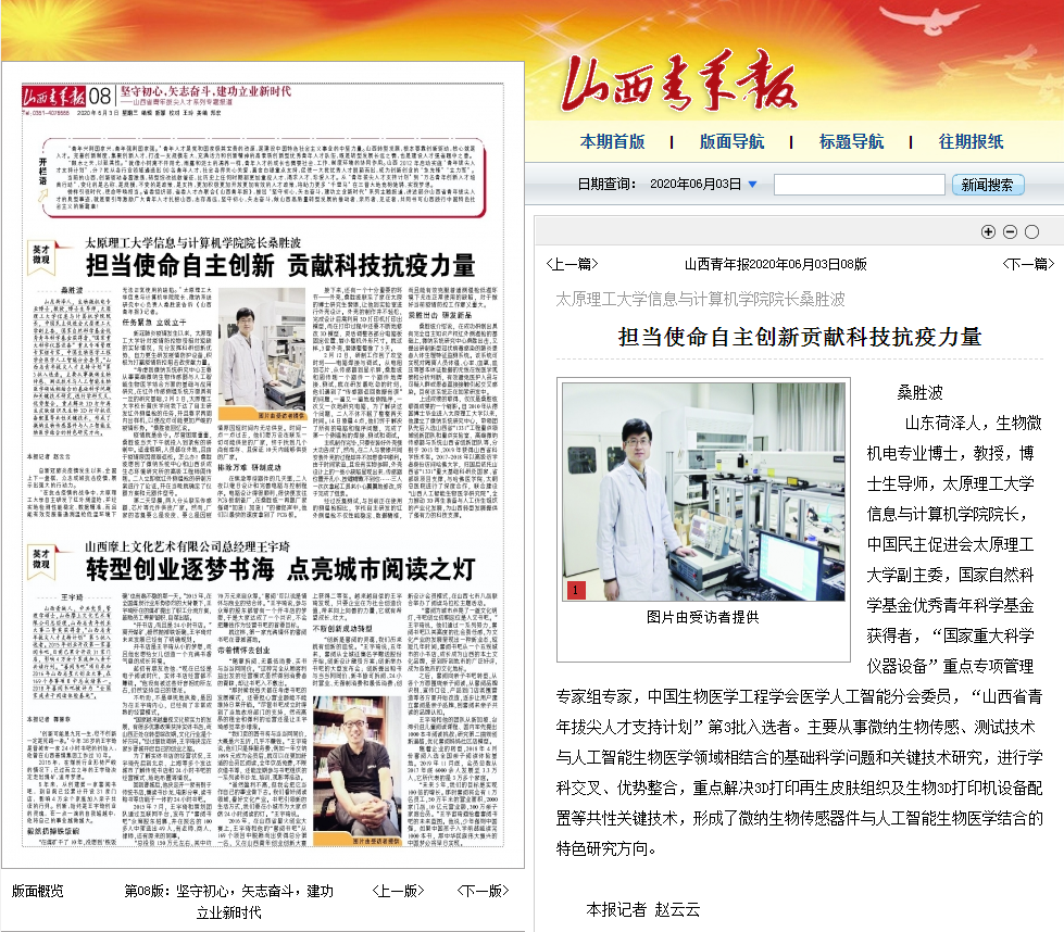 桑胜波,山东荷泽人,生物微机电专业博士,教授,博士生导师,350vip浦京集团官网信息与计算机学院院长,中国民主促进会350vip浦京集团官网副主委,国家自然科学基金优秀青年科学基金获得者,“国家重大科学仪器设备”重点专项管理专家组专家,中国生物医学工程学会医学人工智能分会委员,“山西省青年拔尖人才支持计划”第3批入选者。主要从事微纳生物传感、测试技术与人工智能生物医学领域相结合的基础科学问题和关键技术研究,进行学科交叉、优势整合,重点解决3D打印再生皮肤组织及生物3D打印机设备配置等共性关键技术,形成了微纳生物传感器件与人工智能生物医学结合的特色研究方向。