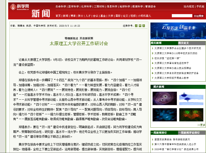 郑强表示,要在“双一流”建设中找准新定位、明确新起点、开启新征程,努力将学校建设成为有尊严、受尊敬的综合性、研究型、高水平一流大学。他还号召全校上下以更加务实的工作举措,推动学校“双一流”建设等各项事业不断迈上新台阶。