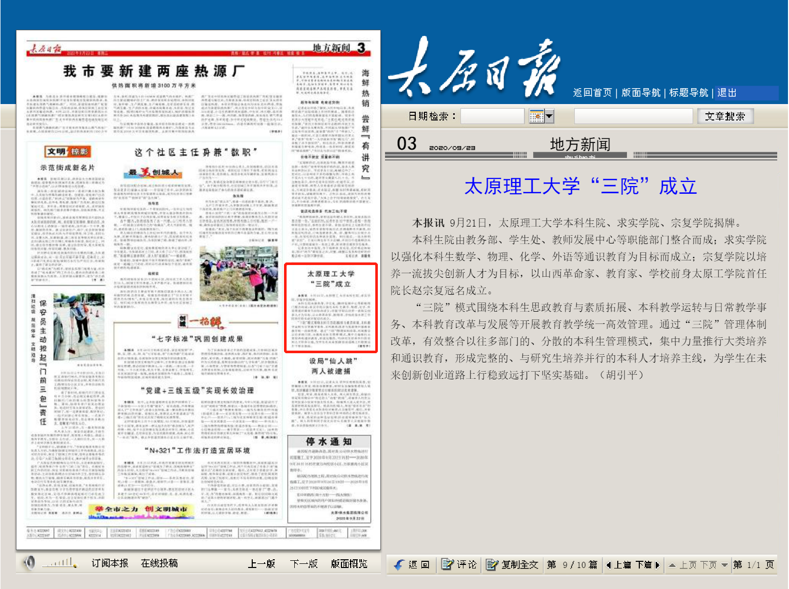 本科生院由教务部、学生处、教师发展中心等职能部门整合而成;求实学院以强化本科生数学、物理、化学、外语等通识教育为目标而成立;宗复学院以培养一流拔尖创新人才为目标,以山西革命家、教育家、学校前身太原工学院首任院长赵宗复冠名成立。