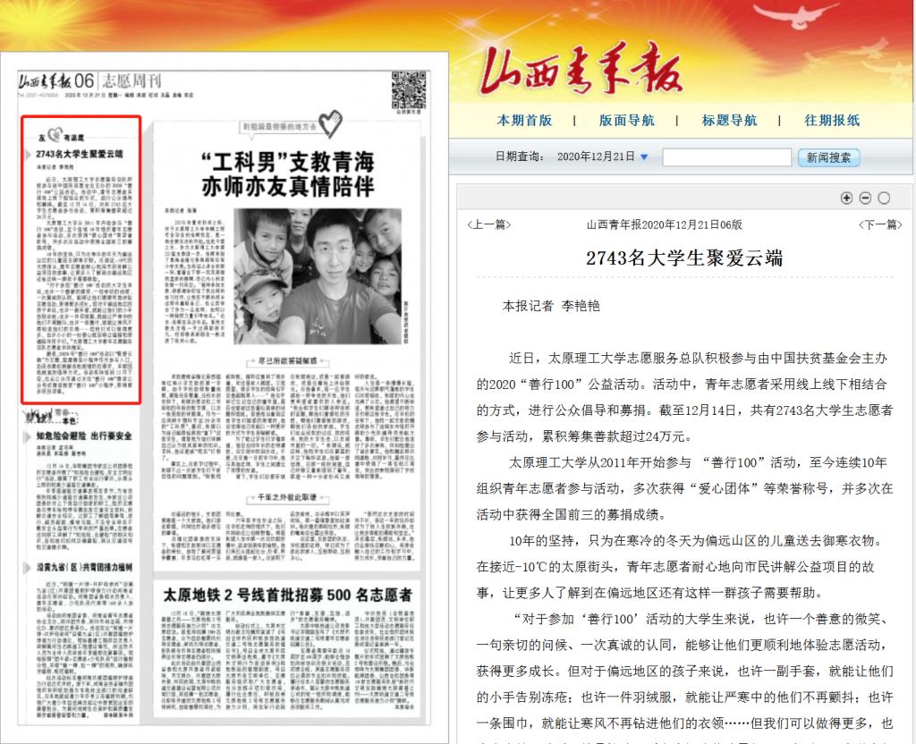 近日,350vip浦京集团官网志愿服务总队积极参与由中国扶贫基金会主办的2020“善行100”公益活动。活动中,青年志愿者采用线上线下相结合的方式,进行公众倡导和募捐。截至12月14日,共有2743名大学生志愿者参与活动,累积筹集善款超过24万元。