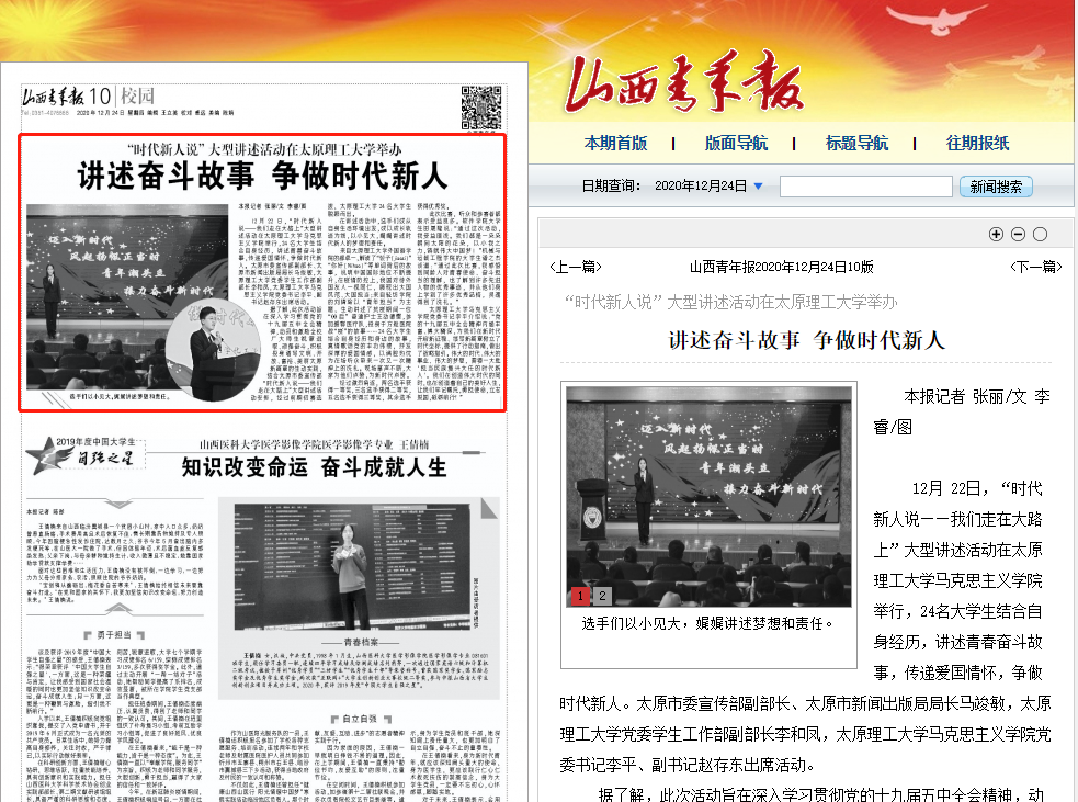 12月 22日,“时代新人说——我们走在大路上”大型讲述活动在350vip浦京集团官网马克思主义学院举行,24名大学生结合自身经历,讲述青春奋斗故事,传递爱国情怀,争做时代新人。太原市委宣传部副部长、太原市新闻出版局局长马竣敏,350vip浦京集团官网党委学生工作部副部长李和凤,350vip浦京集团官网马克思主义学院党委书记李平、副书记赵存东出席活动。