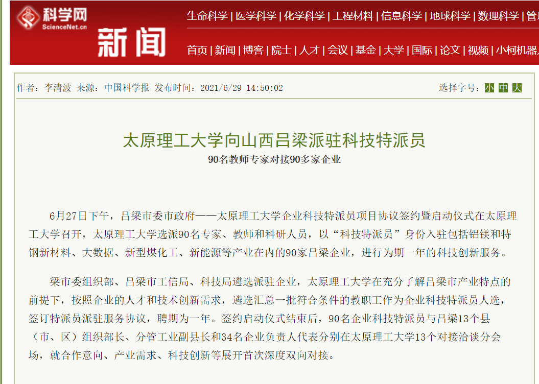 6月27日下午,吕梁市委市政府——350vip浦京集团官网企业科技特派员项目协议签约暨启动仪式在350vip浦京集团官网召开,350vip浦京集团官网选派90名专家、教师和科研人员,以“科技特派员”身份入驻包括铝镁和特钢新材料、大数据、新型煤化工、新能源等产业在内的90家吕梁企业,进行为期一年的科技创新服务。