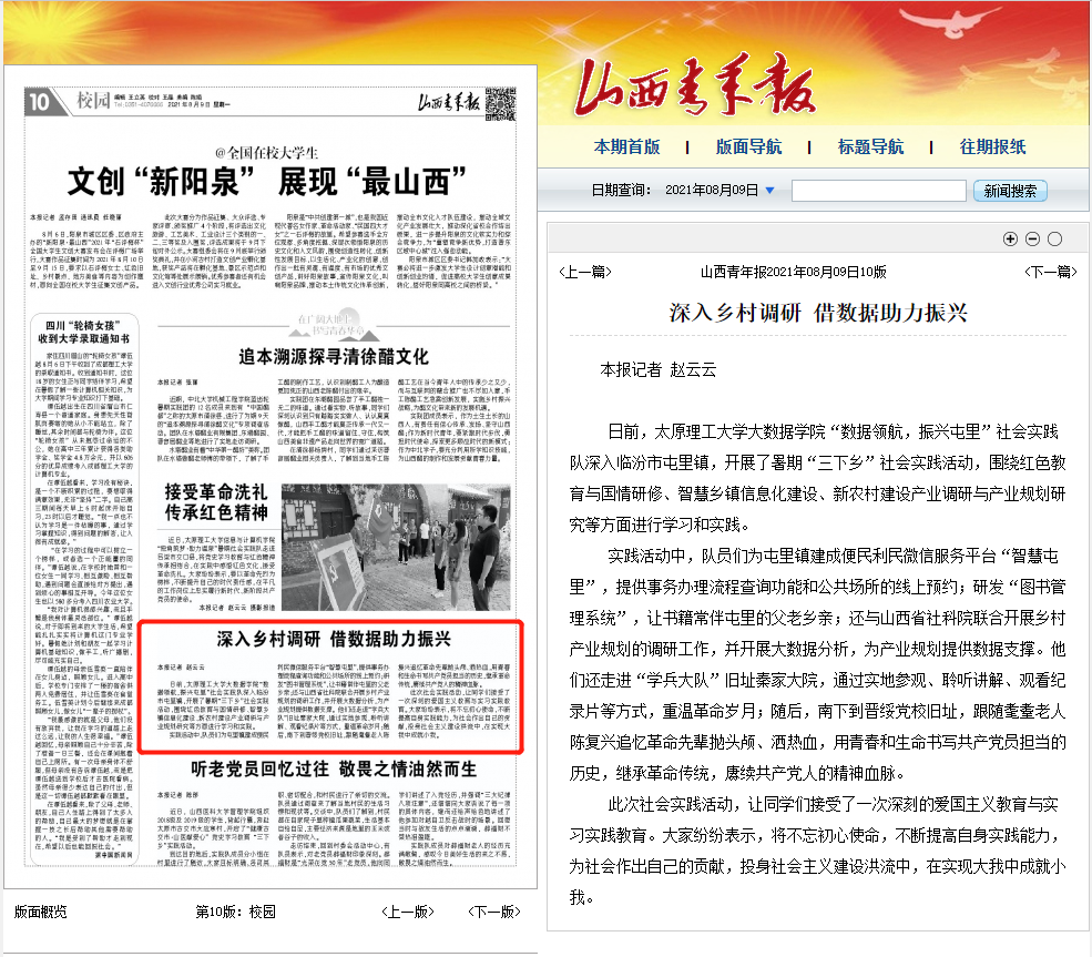 实践活动中,队员们为屯里镇建成便民利民微信服务平台“智慧屯里”,提供事务办理流程查询功能和公共场所的线上预约;研发“图书管理系统”,让书籍常伴屯里的父老乡亲;还与山西省社科院联合开展乡村产业规划的调研工作,并开展大数据分析,为产业规划提供数据支撑。他们还走进“学兵大队”旧址秦家大院,通过实地参观、聆听讲解、观看纪录片等方式,重温革命岁月;随后,南下到晋绥党校旧址,跟随耄耋老人陈复兴追忆革命先辈抛头颅、洒热血,用青春和生命书写共产党员担当的历史,继承革命传统,赓续共产党人的精神血脉。
