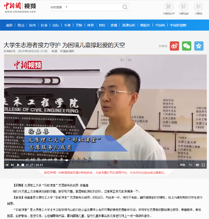 我们这个志愿服务活动是从(20)19年开始,累计到现在有359名志愿者参与其中。我们帮扶的是阳泉等5个地市的困境儿童,我们对他们进行小学到初中的语文、数学、物理、化学、生物等多个学科的课业辅导,以及书法、音乐还有手指舞等等各个方面的培训和辅导。