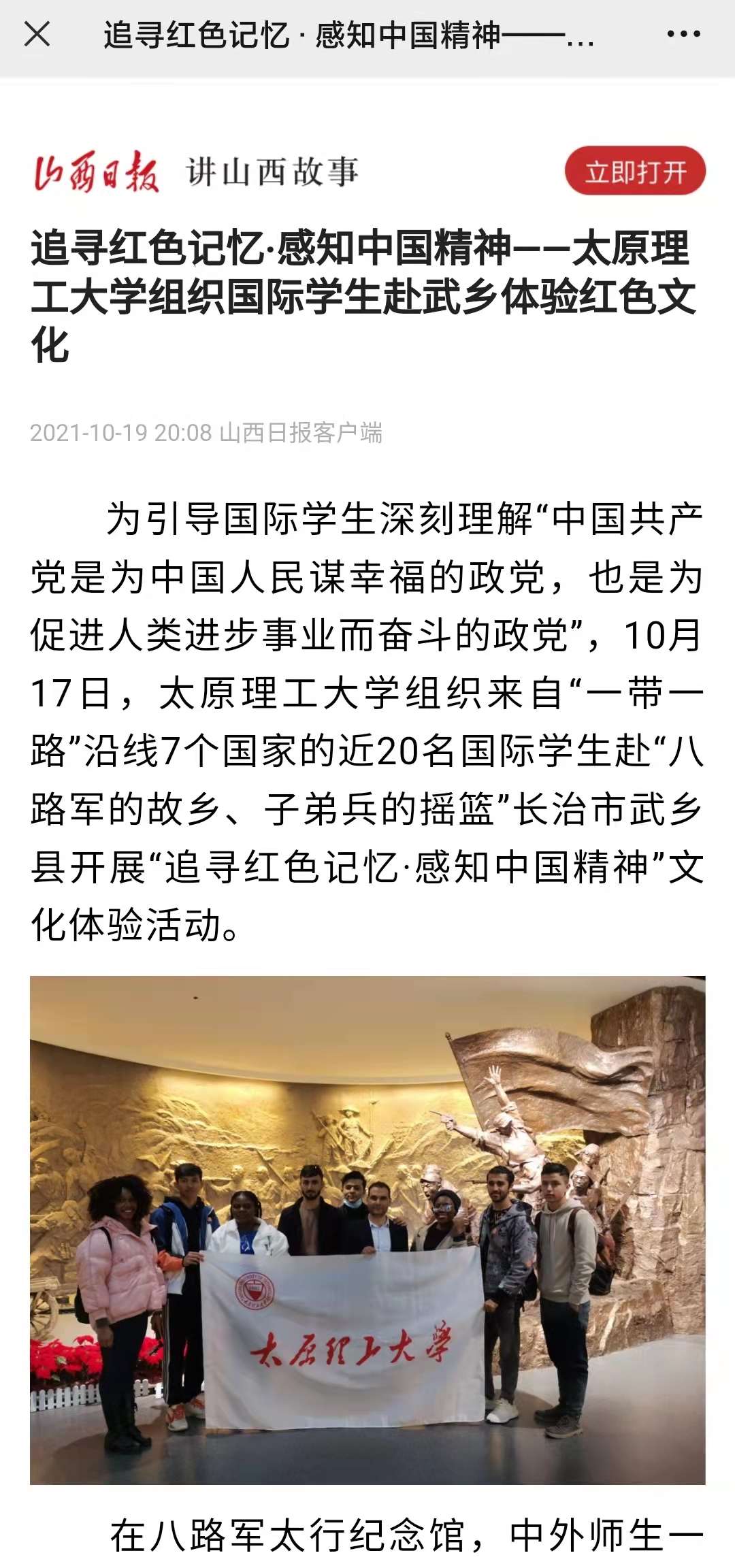 党史学习教育开展以来,该校组织国际学生集体学习习近平主席给北京大学留学生们的回信,参加“汉语桥”全球外国人汉语大会、CGTN“媒体勇士”全球主持人记者网红招募行动、2021年山西省群众文化活动大学生校园歌手网络大赛、校园红色主题花车巡游、“向中国共产党告白”等活动,教育引导国际学生在了解中国国情和中国共产党历史的基础上“爱上中国”,进而向世界展示真实、立体、全面的中国。