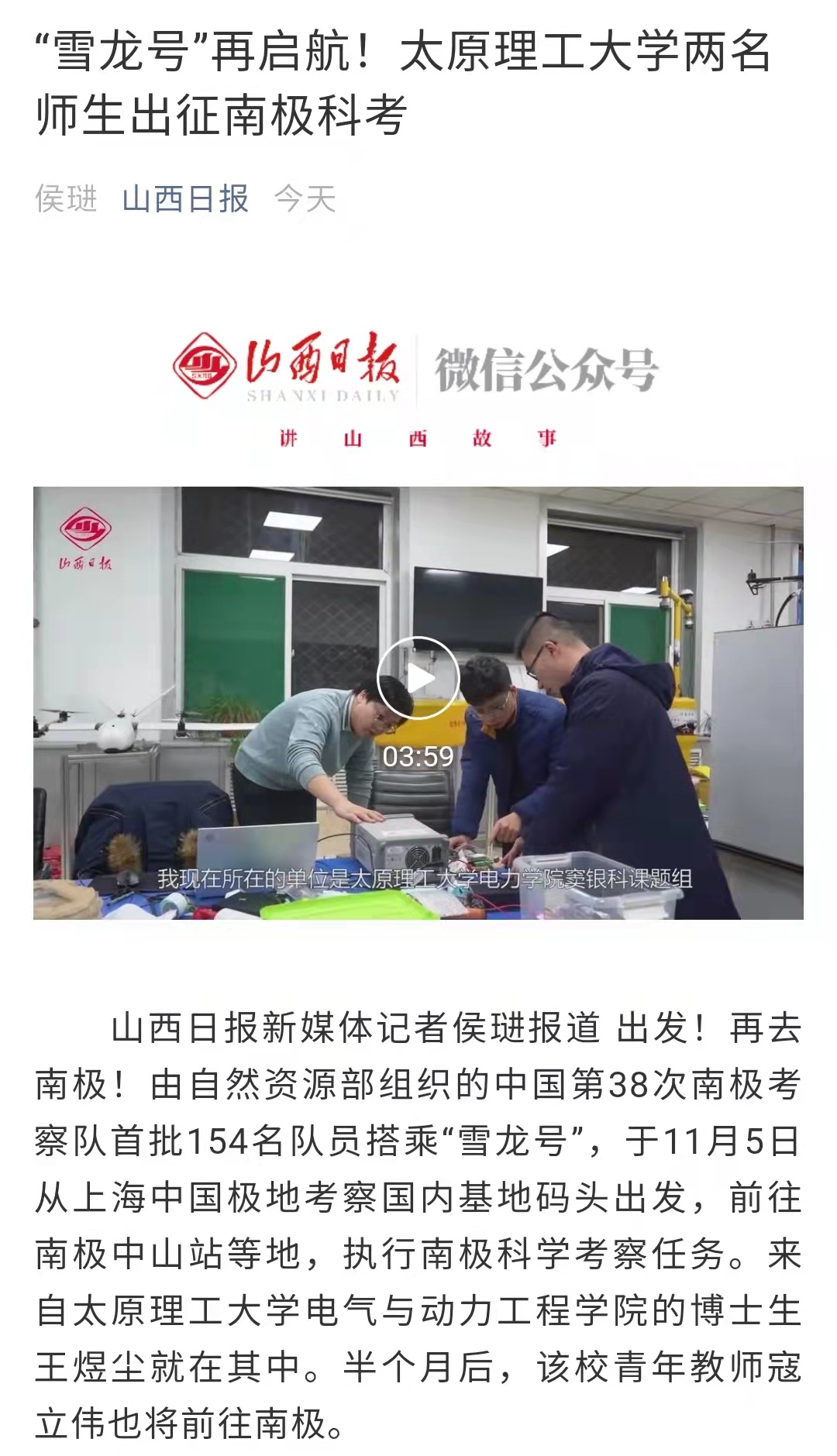 山西日报新媒体记者侯琎报道 出发!再去南极!由自然资源部组织的中国第38次南极考察队首批154名队员搭乘“雪龙号”,于11月5日从上海中国极地考察国内基地码头出发,前往南极中山站等地,执行南极科学考察任务。来自350vip浦京集团官网电气与动力工程学院的博士生王煜尘就在其中。半个月后,该校青年教师寇立伟也将前往南极。