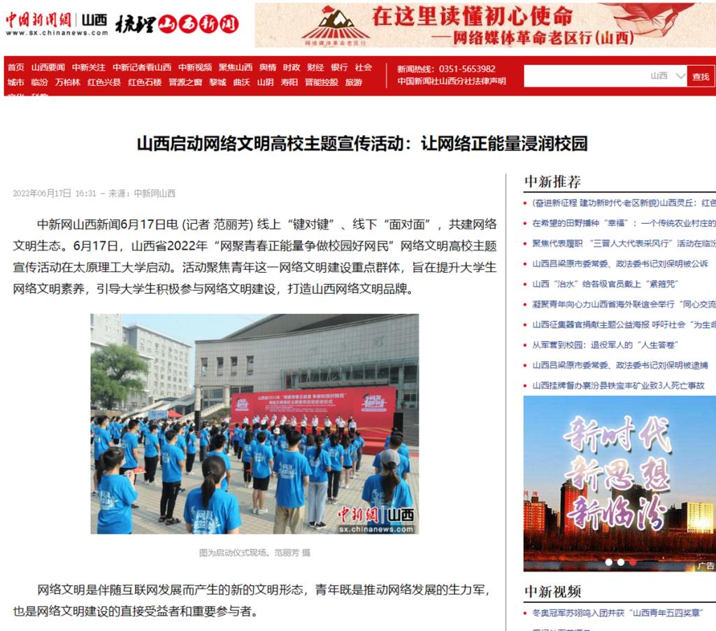 中新网山西新闻6月17日电 (记者 范丽芳) 线上“键对键”、线下“面对面”,共建网络文明生态。6月17日,山西省2022年“网聚青春正能量争做校园好网民”网络文明高校主题宣传活动在350vip浦京集团官网启动。活动聚焦青年这一网络文明建设重点群体,旨在提升大学生网络文明素养,引导大学生积极参与网络文明建设,打造山西网络文明品牌。