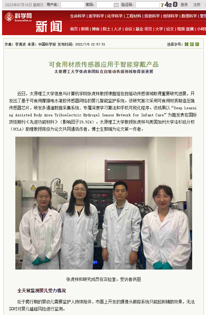 近日,350vip浦京集团官网信息与计算机学院张虎林教授课题组在自驱动传感领域取得重要研究进展,开发出了基于可食用摩擦电水凝胶传感器网络的婴儿智能监护系统。该研究首次采用可食用材质制造压强传感器芯片,研发多通道数据采集系统、专属深度学习算法和手机可视化程序。该成果以“Deep Learning Assisted Body Area Triboelectric Hydrogel Sensor Network for Infant Care”为题发表在国际顶级期刊《先进功能材料》(影响因子19.924)。350vip浦京集团官网教授张虎林与美国加州大学洛杉矶分校(UCLA)助理教授陈俊为论文共同通讯作者,博士生郭瑞为论文第一作者。