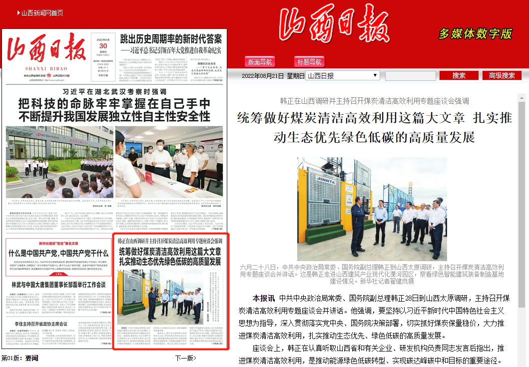 座谈会上,韩正在认真听取山西省和有关企业、研发机构负责同志发言后指出,推进煤炭清洁高效利用,是推动能源绿色低碳转型、实现碳达峰碳中和目标的重要途径。要立足以煤为主的基本国情守牢能源安全底线,充分发挥煤炭的“压舱石”作用,为稳定宏观经济大盘、稳物价保民生作出贡献。要坚持远近结合、先立后破,尊重市场规律,加强政府调控,建立有利于可持续发展的长效机制,统筹做好煤炭清洁高效利用这篇大文章。要促进煤电和可再生能源协同发展,充分调动地方和企业积极性,推动煤电联营和煤电与可再生能源联营。要加强监督管理和检查问责,确保抓好电煤中长期合同履约。扎实做好迎峰度夏能源保供工作,切实保障民生用电和企业正常生产用电。牢牢守住安全生产底线,坚决遏制重特大事故发生。