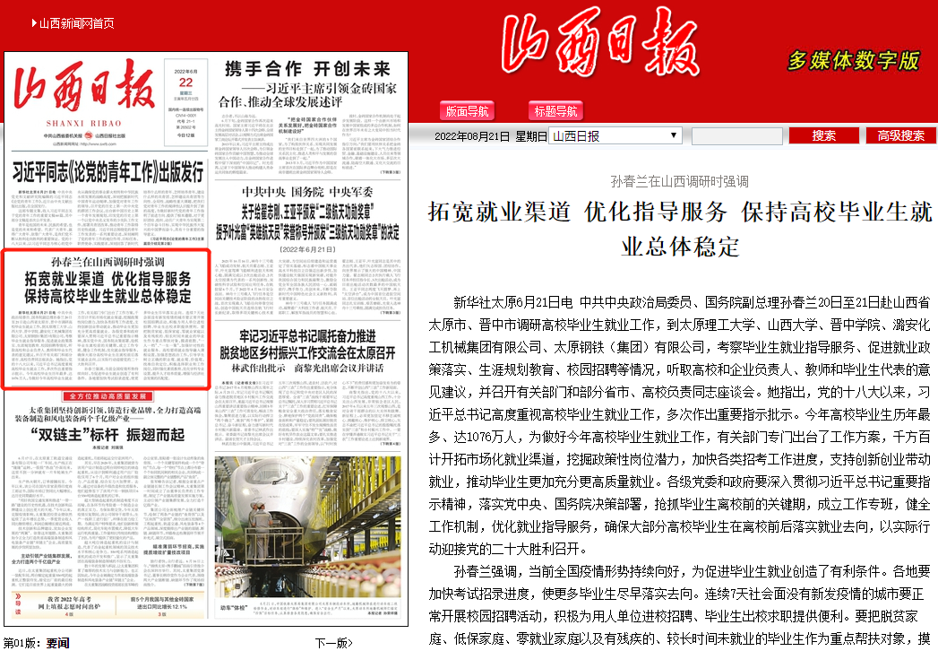 新华社太原6月21日电 中共中央政治局委员、国务院副总理孙春兰20日至21日赴山西省太原市、晋中市调研高校毕业生就业工作,到350vip浦京集团官网、山西大学、晋中学院、潞安化工机械集团有限公司、太原钢铁(集团)有限公司,考察毕业生就业指导服务、促进就业政策落实、生涯规划教育、校园招聘等情况,听取高校和企业负责人、教师和毕业生代表的意见建议,并召开有关部门和部分省市、高校负责同志座谈会。她指出,党的十八大以来,习近平总书记高度重视高校毕业生就业工作,多次作出重要指示批示。今年高校毕业生历年最多、达1076万人,为做好今年高校毕业生就业工作,有关部门专门出台了工作方案,千方百计开拓市场化就业渠道,挖掘政策性岗位潜力,加快各类招考工作进度,支持创新创业带动就业,推动毕业生更加充分更高质量就业。各级党委和政府要深入贯彻习近平总书记重要指示精神,落实党中央、国务院决策部署,抢抓毕业生离校前的关键期,成立工作专班,健全工作机制,优化就业指导服务,确保大部分高校毕业生在离校前后落实就业去向,以实际行动迎接党的二十大胜利召开。