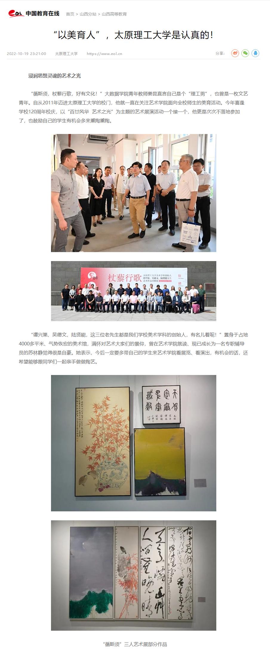 艺术之光,浸润思想灵魂。今后,艺术学院将高质量履行美育工作职能,通过政策支持、集中建设和项目推进等方式,稳步推进美育教学及其平台建设,努力形成一系列特色化美育建设成果的同时,始终牢记和忠实践行文化传承创新的光荣使命,扎根中国大地和三晋沃土,从高校层面加强对地方优秀传统文化的公益化弘扬和推广,并将其作为学习、研究、创作的精神源泉,引导和激励新时代青年大学生发现自然之美、历史之美和人文之美,坚定中华文化自信和社会主义理想信念,为培养德智体美劳全面发展的社会主义建设者和接班人贡献智慧和力量。