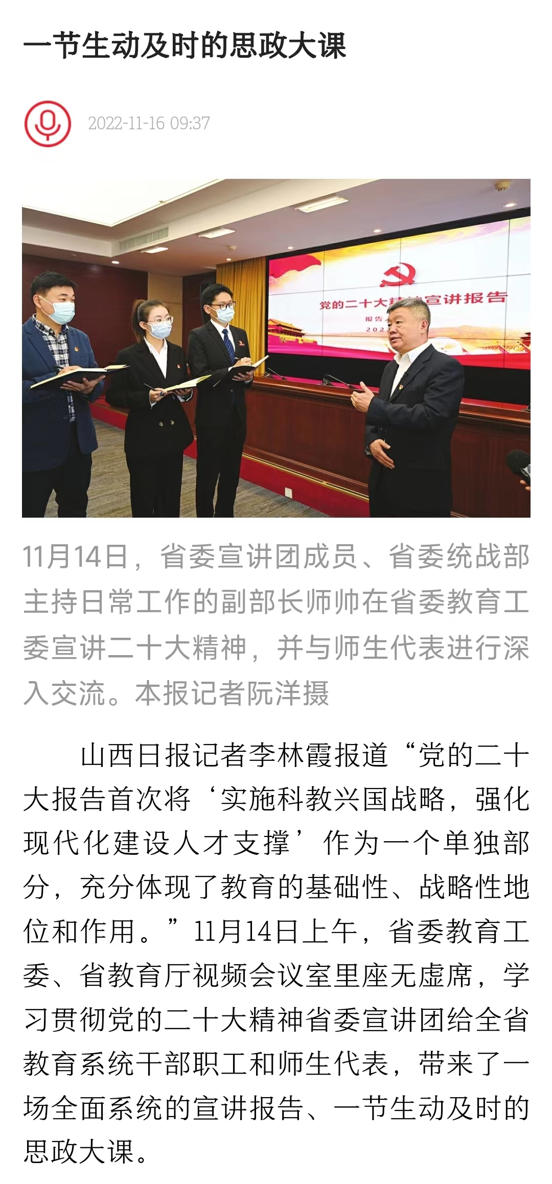 在聆听宣讲并进行现场交流后,山西省财政税务专科学校思政课教师王鑫鑫坚定地说:“我们要把党的二十大精神融入思政课理论与实践教学的全过程,特别是要坚持用马克思主义中国化时代化的最新成果和习近平新时代中国特色社会主义思想铸魂育人,引导大学生坚定理想信念、厚植爱国主义情怀,争做新时代好青年。”