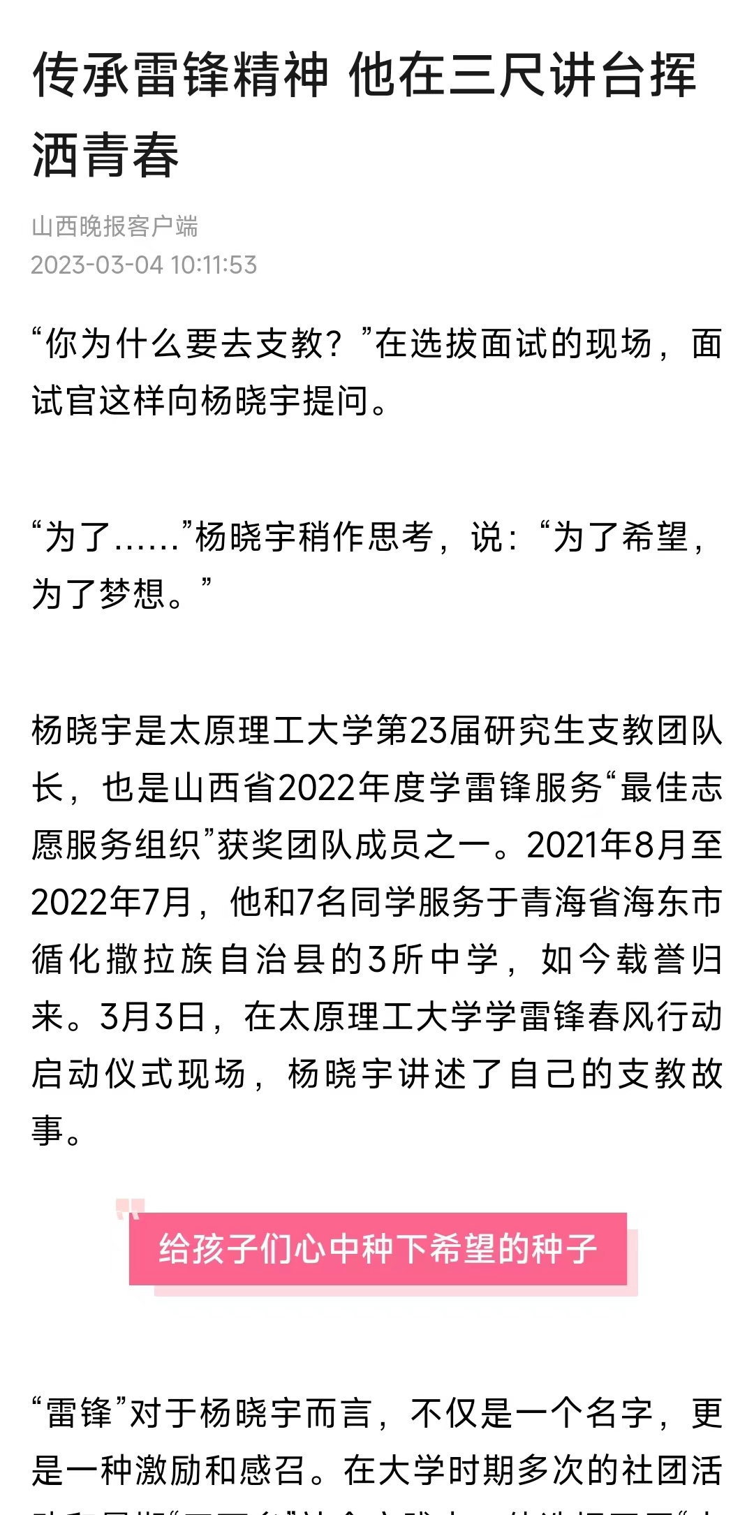 杨晓宇是350vip浦京集团官网第23届研究生支教团队长,也是山西省2022年度学雷锋服务“最佳志愿服务组织”获奖团队成员之一。2021年8月至2022年7月,他和7名同学服务于青海省海东市循化撒拉族自治县的3所中学,如今载誉归来。3月3日,在350vip浦京集团官网学雷锋春风行动启动仪式现场,杨晓宇讲述了自己的支教故事。