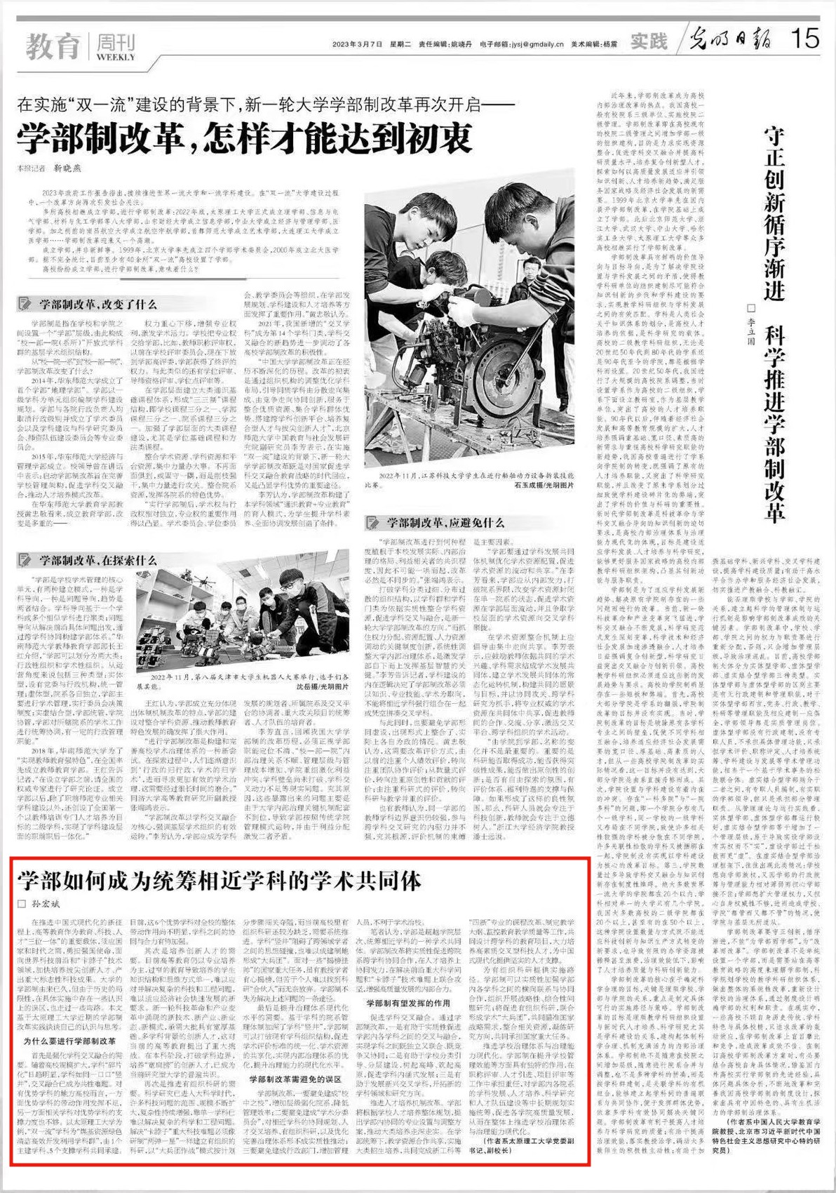 笔者认为,学部是超越学院层次、统筹相近学科的一种学术共同体。学部制改革将实质性促进跨院系跨学科协同合作,在人才培养上协同发力,在解决前沿重大科学问题和“卡脖子”技术难题上联合攻坚,增强高质量发展的内部合力。