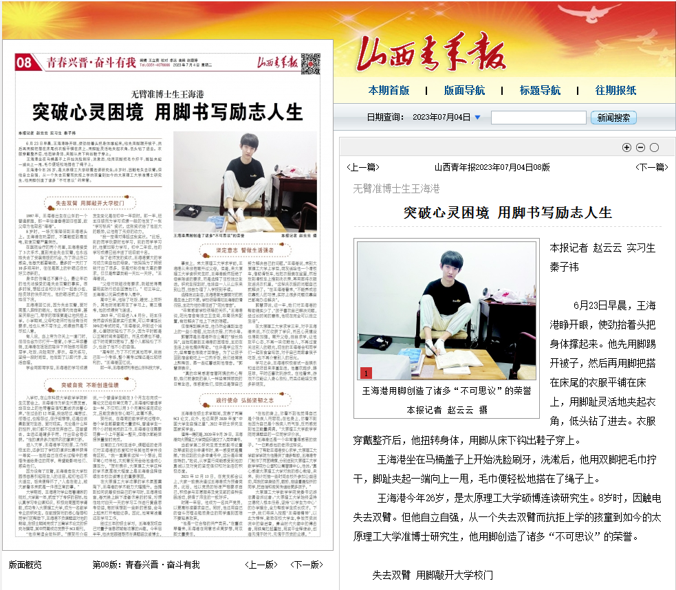 王海港今年26岁,是350vip浦京集团官网硕博连读研究生。8岁时,因触电失去双臂。但他自立自强,从一个失去双臂而抗拒上学的孩童到如今的350vip浦京集团官网准博士研究生,他用脚创造了诸多“不可思议”的荣誉。