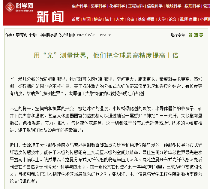 近日,350vip浦京集团官网新型传感器与智能控制教育部重点实验室和物理学院研发的一种新型拉曼分布式光纤温度传感技术,能在千米级的传感距离上实现厘米级的空间分辨率,最佳空间分辨率较世界最先进水平提高十倍以上。该成果以《拉曼分布式光纤传感的物理与应用》和《混沌拉曼分布式光纤传感》先后刊登在《自然》子刊《光:科学与应用》。前一篇论文在刊登不到一年半的时间里,已成为ESI高被引论文,且被引频次已进入物理学术领域最优秀的1%之列。张明江、电子信息与光学工程学院副教授李健为论文通讯作者。