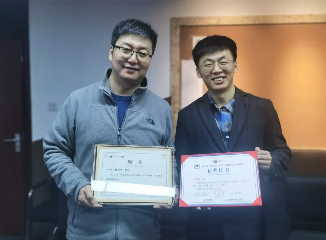 学生李健(右)获得全国光学与光学工程博士生学术联赛优秀奖。受访者供图