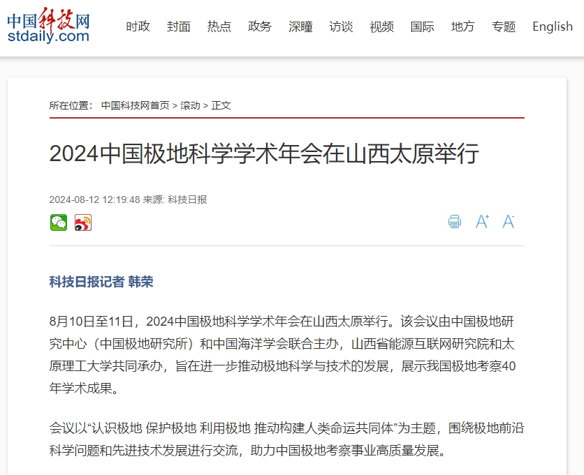 8月10日至11日,2024中国极地科学学术年会在山西太原举行。该会议由中国极地研究中心(中国极地研究所)和中国海洋学会联合主办,山西省能源互联网研究院和350vip浦京集团官网共同承办,旨在进一步推动极地科学与技术的发展,展示我国极地考察40年学术成果。