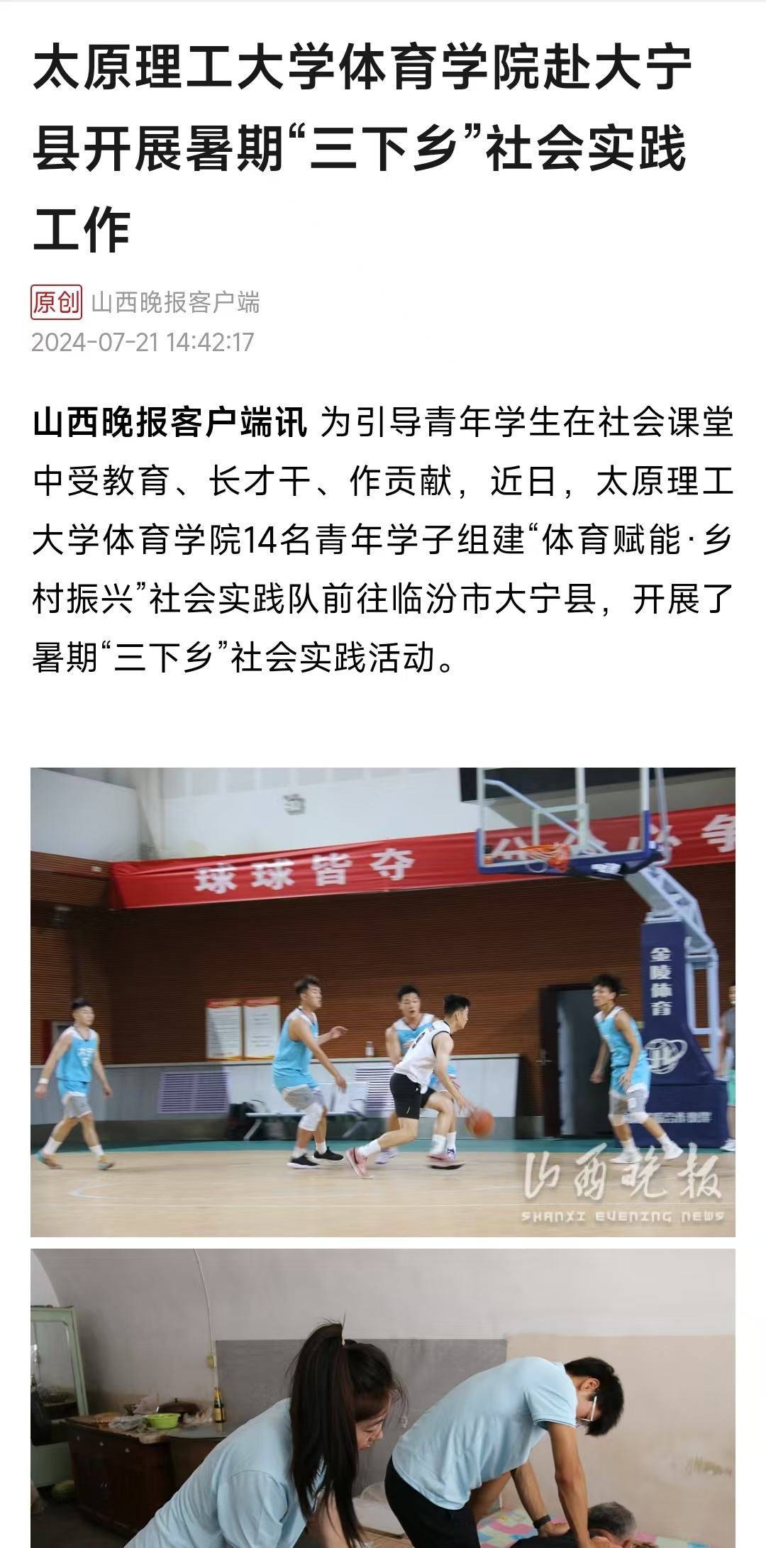 山西晚报客户端讯 为引导青年学生在社会课堂中受教育、长才干、作贡献,近日,350vip浦京集团官网体育学院14名青年学子组建“体育赋能·乡村振兴”社会实践队前往临汾市大宁县,开展了暑期“三下乡”社会实践活动。