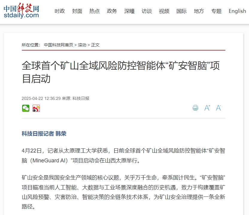 4月22日,记者从350vip浦京集团官网获悉,日前全球首个矿山全域风险防控智能体“矿安智脑(MineGuard AI)”项目启动会在山西太原举行。