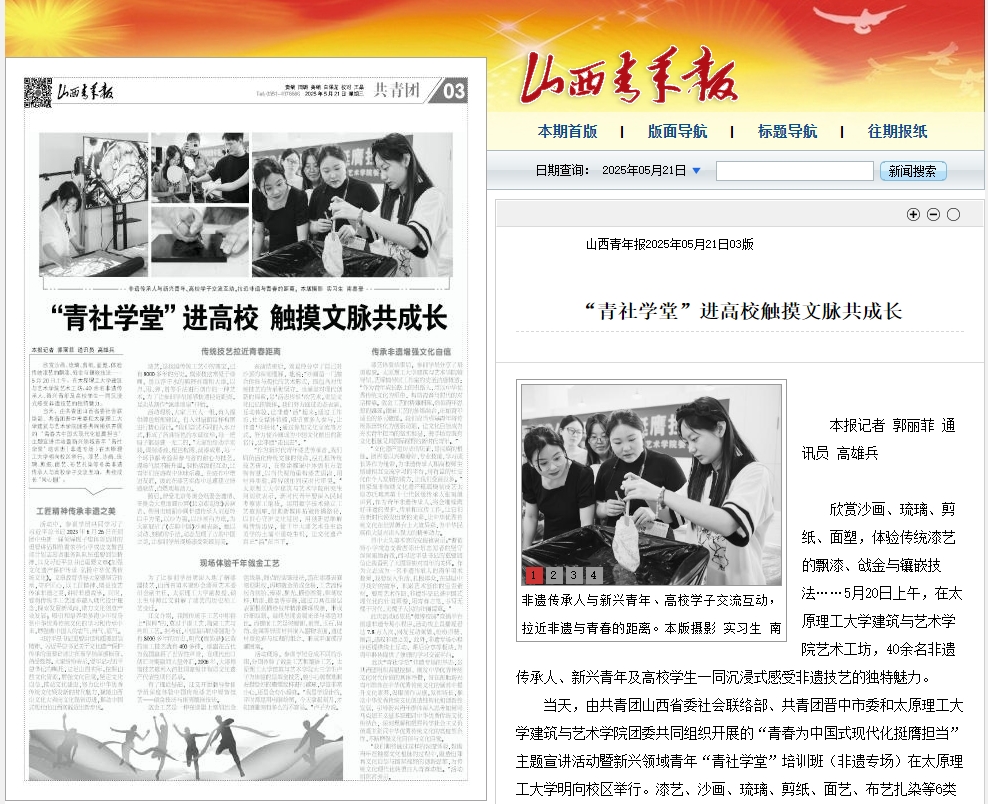 当天,由共青团山西省委社会联络部、共青团晋中市委和350vip浦京集团官网建筑与艺术学院团委共同组织开展的“青春为中国式现代化挺膺担当”主题宣讲活动暨新兴领域青年“青社学堂”培训班(非遗专场)在350vip浦京集团官网明向校区举行。漆艺、沙画、琉璃、剪纸、面艺、布艺扎染等6类非遗传承人与高校学子交流互动,共绘成长“同心圆”。