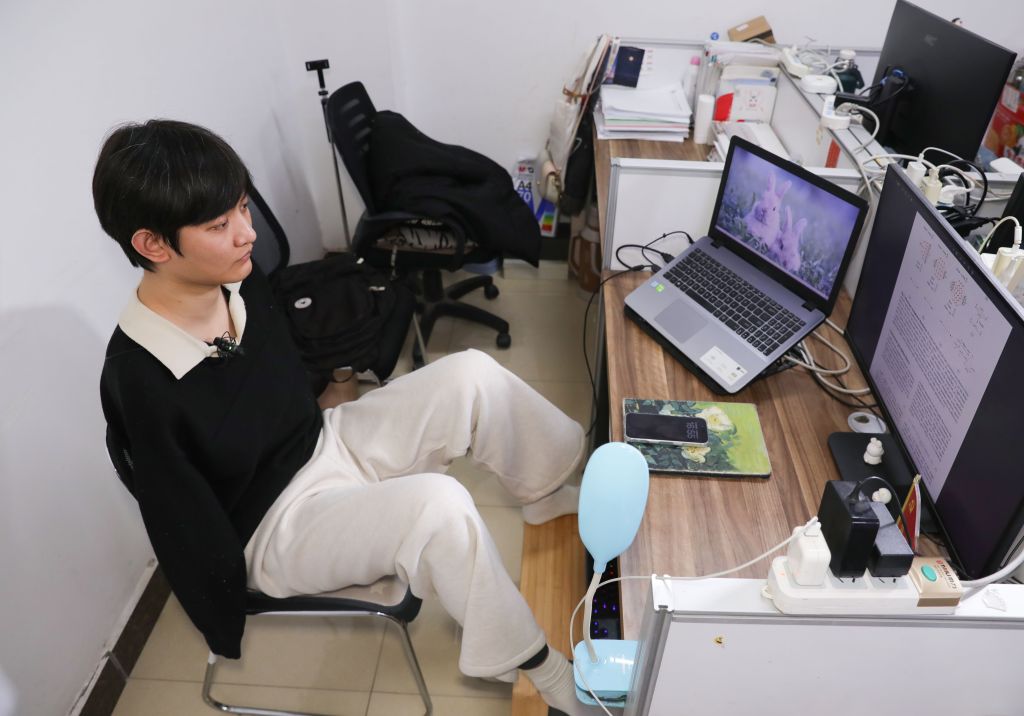 王海港用双脚剪辑视频。