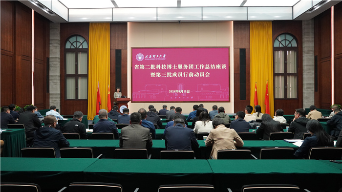 4月11日下午,浦京在明向校区行政楼鹏飞会堂召开省第二批科技博士服务团工作总结座谈暨第三批成员行前动员会。校党委副书记刘润祥,校党委常委、副校长肖连团出席,校党委组织部、人事处、人才办、科学技术研究院、国内合作处等相关职能处室负责人,各专业学院党委书记,省第二批、第三批科技博士服务团成员等参加会议。