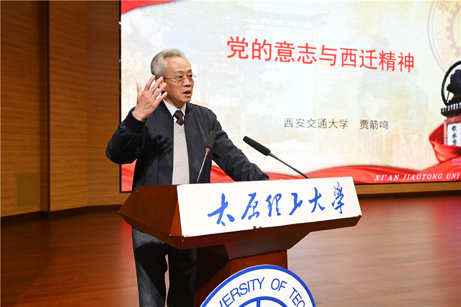 在题为《党的意志与西迁精神》的报告中,贾箭鸣以上世纪五十年代交通大学的西迁为例,回顾了中华民族从站起来到富起来到强起来的艰难历程,分析了新中国成立初期工业建设和人才建设所面临的问题,讲述了交通大学内迁西安的历史缘由。“党的号召就是命令,党和国家的利益高于一切。交大师生响应国家号召,告别条件优越的上海,来到古都西安,为国家的建设、为西部的科教事业发展奉献青春年华,创造了我国高等教育史上的奇迹。” 著名机械学专家张寰镜、教务长陈大燮、数学家张鸿带头赴西安创业终身扎根大西北,著名物理学家殷大钧携家带口前往西安,“中国电机之父”钟兆琳安顿好病妻孤身一人奔赴西安,举家西迁带头人沈尚贤,六旬高龄赴西安培养青年教师的朱公谨,杰出无线电学家黄席椿放弃升职机会西迁创业,周惠久、陈学俊、沈云扉、朱城、唐照千、孟庆集……贾箭鸣以一件件生动的事例、一个个感人的故事生动鲜活地展示了以这些老一辈知识分子为代表的交大“西迁人”胸怀赤子之心、坚守报国之志的胸襟与情怀,深刻阐释了西迁精神“胸怀大局、无私奉献、弘扬传统、艰苦创业”的丰富内涵。