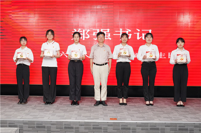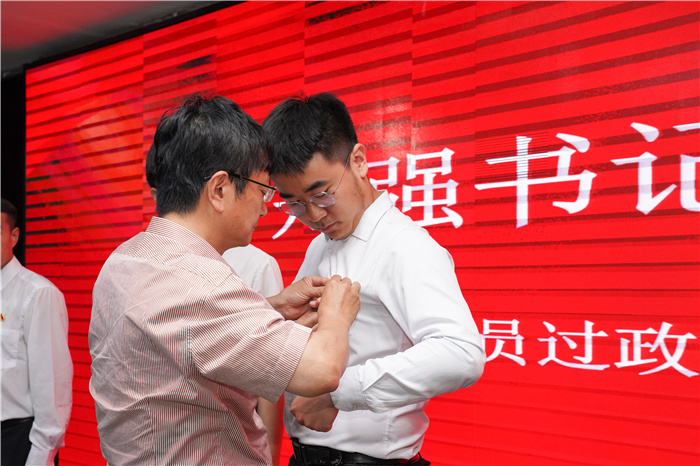 在庄严的国际歌声中,郑强为支部6月入党的新党员庆祝政治生日,为他们佩戴党员徽章、颁发生日贺卡。